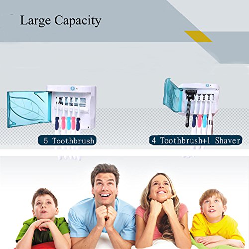 - LARGE CAPACITY: The uv toothbrush sanitizer can store up to 5 toothbrushes, or 4 toothbrushes and 1 shaver. Also disinfects make up brushes, tweezers, nail clippers, dental tools, earrings & more accessories.