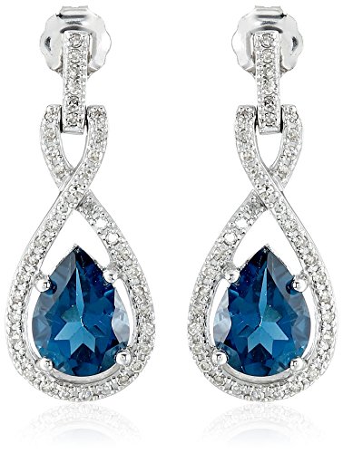 White gold drop earring featuring blue topaz teardrop nestled in swirls of white diamonds