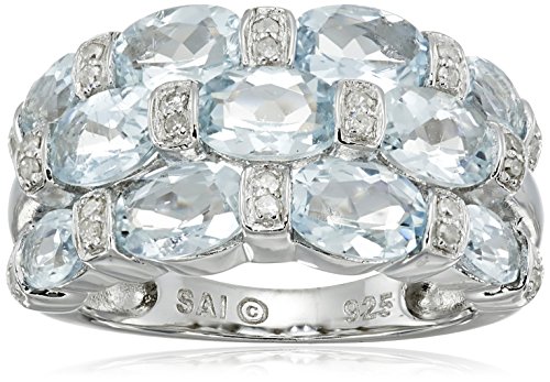 Sterling silver ring featuring three rows of oval aquamarine gemstones interspersed with small diamond rounds