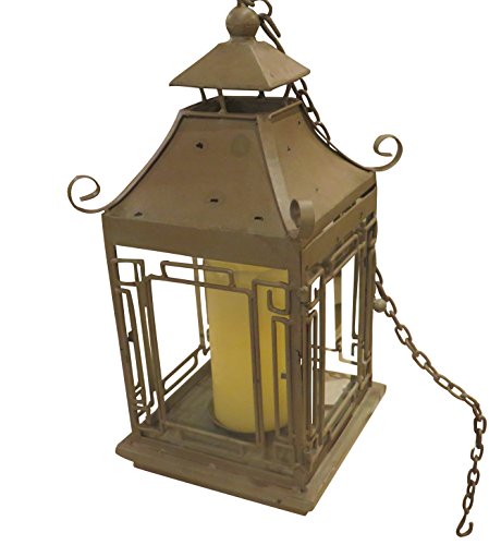 -. Feature : Item: Candle Lantern / Design: Pagoda - Distressed Green / Size: 15" tall x 8.5" square. Includes 14" chain. / Material: Iron, Tole, and Glass. Use: Indoor or Outdoor Use. / Condition/ Quality: Brand New, First Quality.