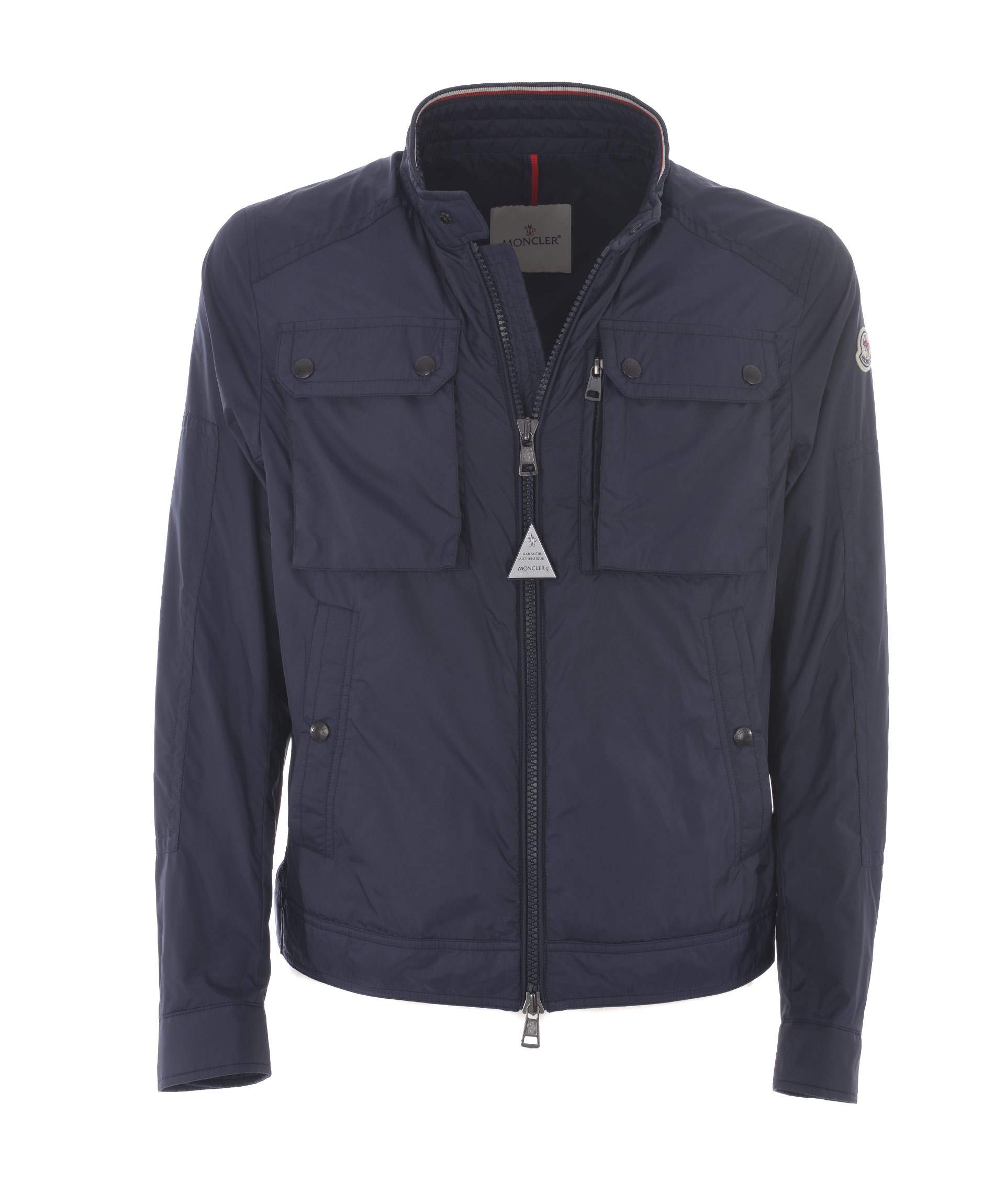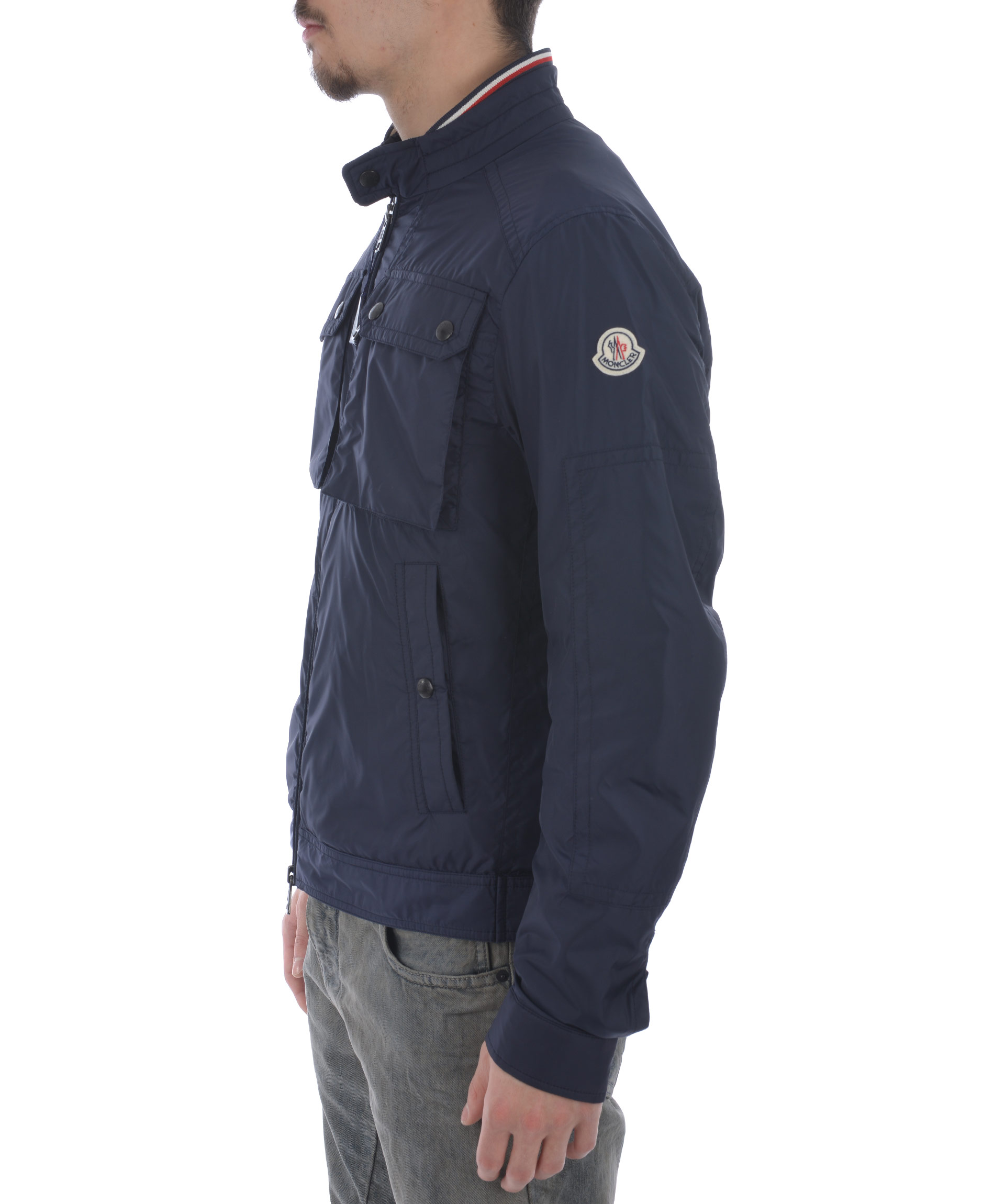 Levens Jacket from Moncler: Blue Levens Jacket with a stand up collar, a zip and press stud fastening, front flap pockets, side pockets, long sleeves, a logo to the left arm, press stud cuffs and a straight hem.