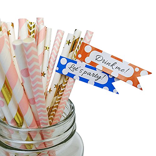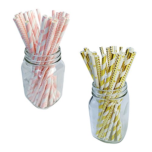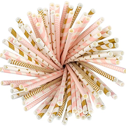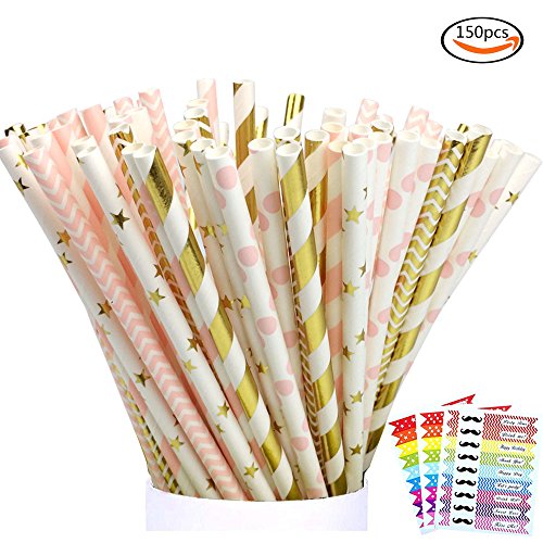 Outuxed 150Pack Biodegradable Paper Straws Drinking Decoration Straws Striped Polka Dot Straws for Birthday, Wedding(Pink,Gold)