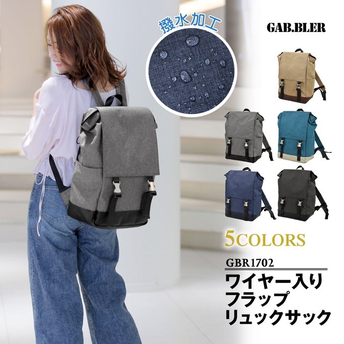 Gab・Bler(ギャブラー) GBR1702 ワイヤー入りフラップリュックサック 開口部にマグネットとワイヤーを仕込んだ、パカっと開くリュックサック。 ・開口部には4ヶ所の強力マグネット入りでスムーズに開閉が可能。 ・メイン素材には撥水加工ポリエステルを採用。 ・両サイドにはオープンポケットを装備。 ・内側にはスマホ用ポケット、オープンポケット、ペン差しも装備。 ・クッション素材のPCポケット付き。 ・背面のファスナーからも内側にアクセス可能。 ・ショルダーベルトはハーネス付き。