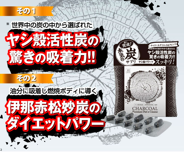 | 原材料名 | ヤシ殻活性炭(国内製造)、伊那赤松炭、イソマルトオリゴ糖、イヌリン/HPMC、結晶セルロース、ステアリン酸カルシウム、微粒二酸化ケイ素 |