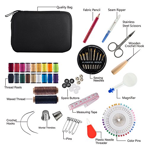 - EVERYTHING YOU NEED IN A SEWING KIT - Everything you need in one compact kit, more than 120 gears in one kit. Being prepared for anything is important, and having enough is necessary, but having more is even better! In our sewing kit, you will find everything from assorted needles, thimbles, and scissors to multiple colors of spools of thread, Magnifier, spare bottons, measuring tape and a quality bag to go with more than any other sewing and mending kit have.
