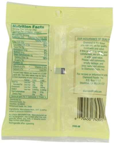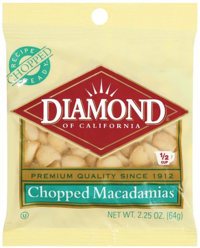 Pack of 12, 2.25-oz bags (1/2 cup) of Diamond of California Chopped Macadamias^Diamond of California has offered fresh, high quality and great tasting nuts for over a 100 years^Unseasoned and ready for baking, cooking, snacking and using as a topping^Kosher Certified
