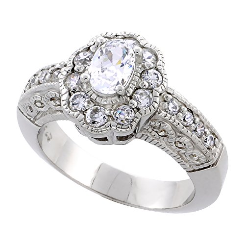 -. Title : Sterling Silver Vintage Style Flower Halo Cubic Zirconia Ring with 6x4 mm (0.43 carat size) Oval Shape High Quality CZ Stone, 7/16 inch (11 mm) wide