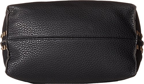 Magnetic snap closure with additional drawstring security. Removable carry handle and removable crossbody strap. Exterior features pyramid stud detail and tonal stitching. Flat base. Lined interior flaunts back wall zip pocket an two slip pockets. Imported.