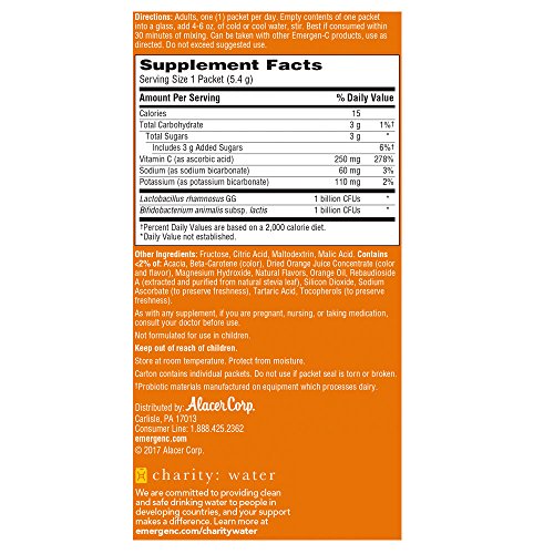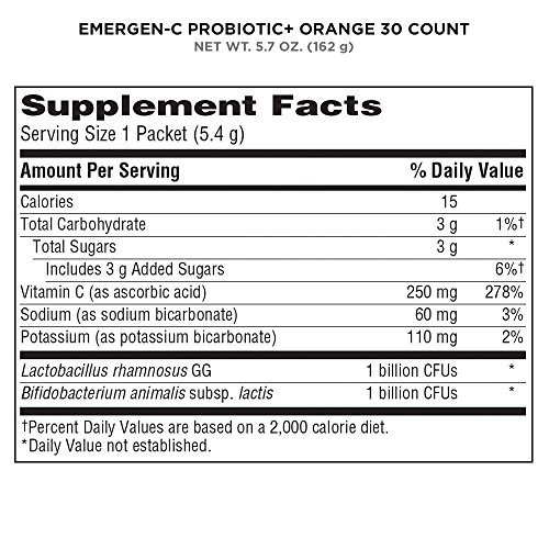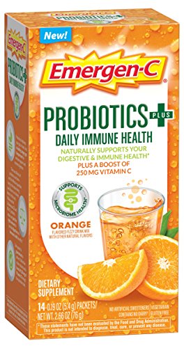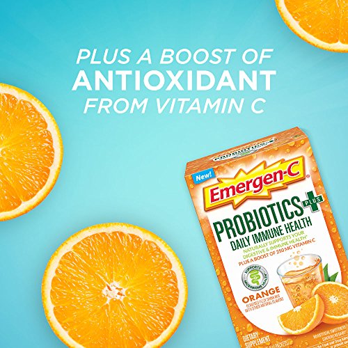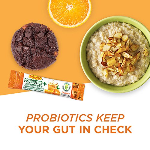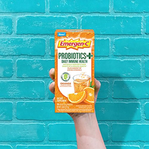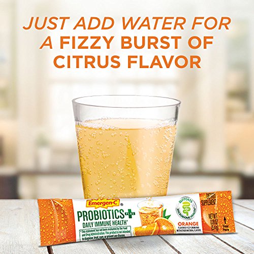 Includes 30 individual serving-size packets (0.19 oz. each) of Emergen-C Probiotics+ Orange flavor fizzy drink mix powder for women and men