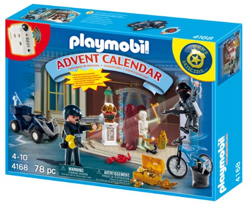 -. Feature : Celebrate each day of Advent with the Playmobil Advent Calendar Police / Playmobil is the largest toy manufacturer in Germany / 24 police-themed surP.R.Ise pieces are sure to delight any child / Put on the police badge and setup the alarm to warn when a thief is present / Includes backdrop, two figures, police quad car, bicycle, mummy, pharaoh's bust, treasure chest, snake and other accessories