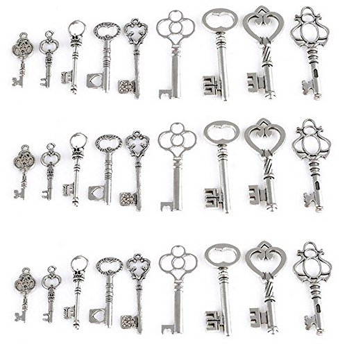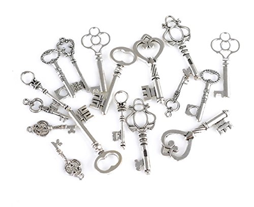 AlphaAcc Skeleton Key Charm Set in Antique Silver 9 Different Styles - Vintage Style Key Charms (45 Charms)