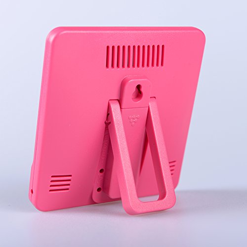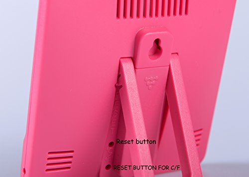 Displays in Celsius or Fahrenheit.Reset button is no the product back, behind the table standing support.