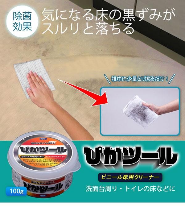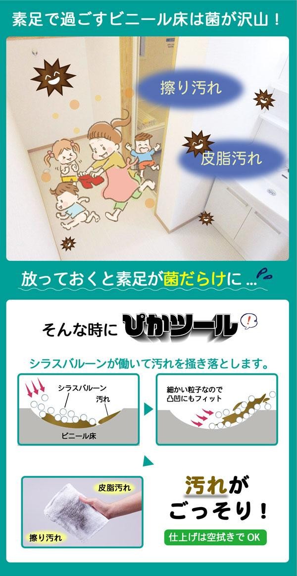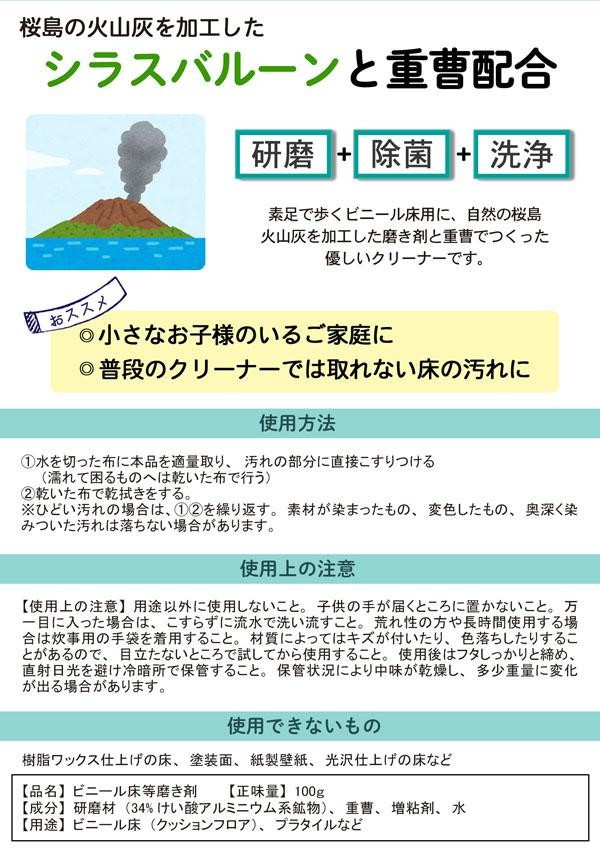 | ビニール床の黒ずみ汚れを簡単に落とすクリーナー。軽く磨くだけですすぎいらず。鹿児島火山灰から生まれた微粒研磨材に重曹を混ぜた除菌研磨クリーナーです。 |