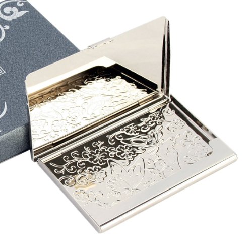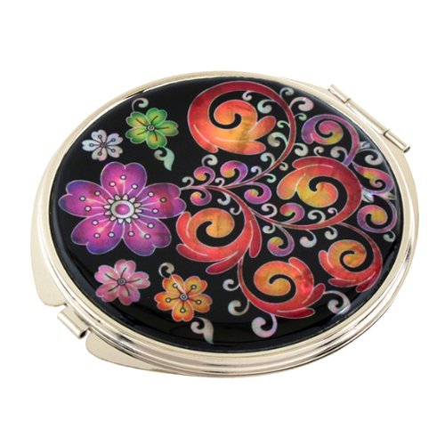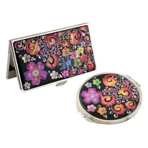 Antique Alive Mother of Pearl Purple Arabesque Flower Design Business Credit Card Holder with Compact Mirror Set (B121)