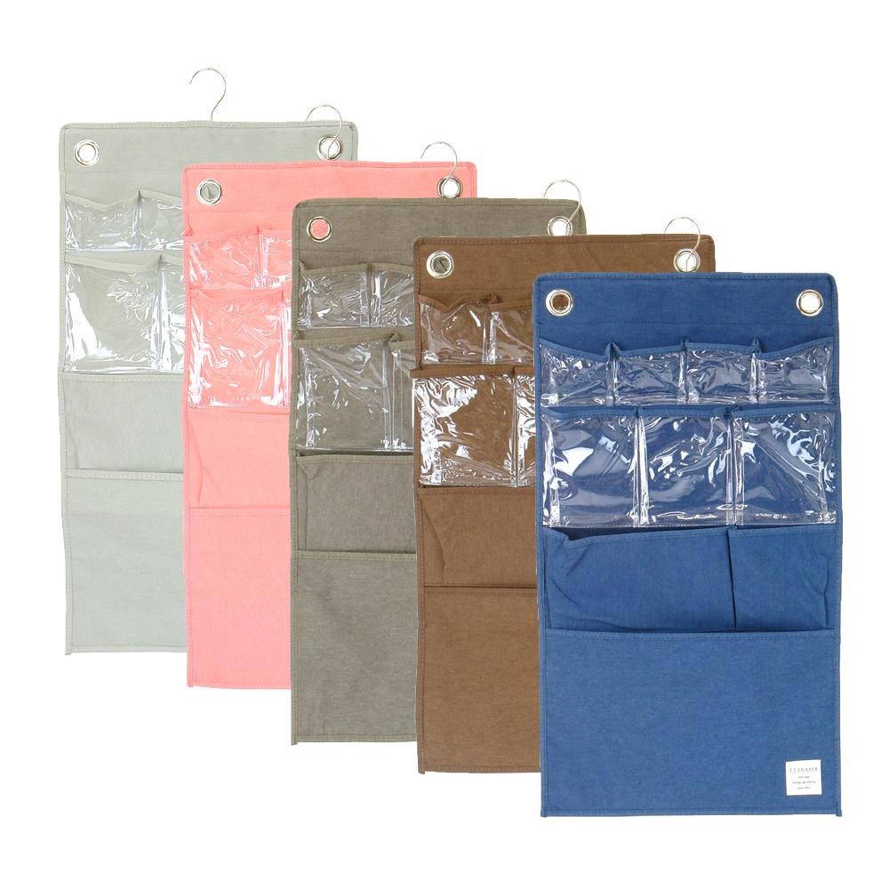 ナチュラルテイストな素材感で、肌触りがよい柔らかい素材を使用したウォールポケット。大きさの違う5種類のポケットが付いていて使いやすく、折りたたみ可能なので使用しないときも場所を取りません。壁面のスペースも無駄にしない為の収納用品です。 |