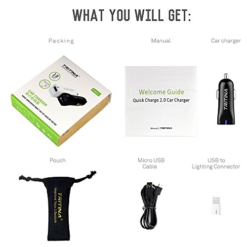 WHAT YOU GOT - Fast Car Charger (Premium 18W 1-Port USB Car Charger with Qualcomm Quick Charge 2.0), welcome guide, USB Cable, Lighting Connector and Quality Pouch.