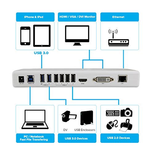 -. Feature : CHARGE & SYNC UP TO 6 DEVICES AT ONCE Docking station connects to a single USB port on your desktop or laptop and gives you 2 USB 3.0 ports (1 Simultaneously Charging Port While in Hybernation) and 4 USB 2.0 Ports for charging / ADD A SECOND MONITOR WITH EASE Laptop docking station also provides you with HDMI & DVI VGA supports for adding a second monitor to your setup with high resolution picture quality; Also includes an audio input/output & a Gigabit Ethernet port! / WIDELY COMPATIBLE Universal docking station is suitable for use with Windows 10, 8.1, 8, 7, & legacy XP systems, Mac OS, Android. Download Lastest Driver from Cerfitied DisplayLink website. / SO SIMPLE TO USE No need to reboot to add or remove devices from the universal laptop docking station! Plug and play design with no drivers to install; Power-saving hibernation and suspend modes / SATISFACTION GUARANTEED Get the benefits of a 30-day money-back guarantee and the protection of an 18-month warranty on your purchase of our USB 3.0 docking station. Fast Same-Day Shipping by 12:00 PM PDT!