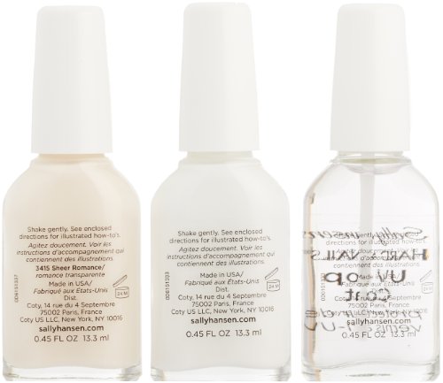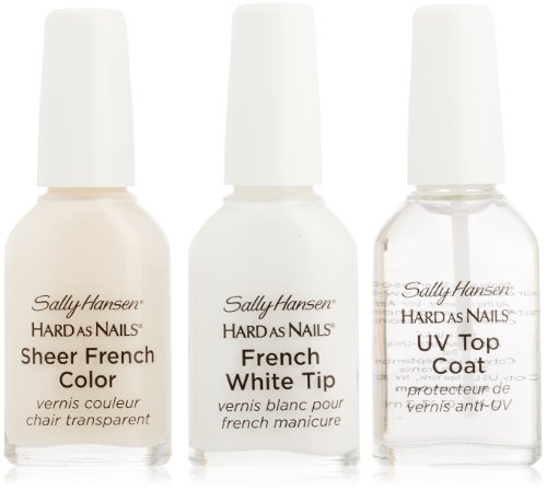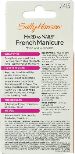 ReleaseDate : 2015-07-16 Studio : Sally Hansen Publisher : Sally Hansen Binding : Health and Beauty Product Description Sally Hansen hard as nails french manicure kit is everything you need for a hard as nails chip-resistant, long-lasting french manicure. 2 steps to a chip-resistant french manicure. Shade preview makes it easy to select the right color for you. Kit contains: 1) fashion-forward french shades that won't chip or fade. 2) hard as nails french white for pure white tips. 3) self-adhesive nail guides for mistake proof application. 4) hard as nails uv top coat to help prevent chipping, splitting and yellowing. 5) easy step-by-step instructions. 0