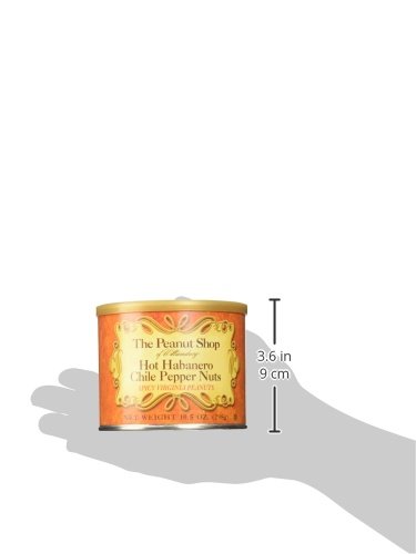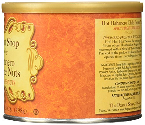 -. Binding : Grocery -. Brand : The Peanut Shop of Williamsburg -. EAN : 0053136896528 -. Feature : Distinctively unique and different and unbelievably crisp / Our same super extra large hand cooked Virginia peanuts are lightly seasoned in a variety of flavors / Try a tin for yourself and give several as gifts to those you wish to receive the finest -. Label : The Peanut Shop of Williamsburg -. Manufacturer : The Peanut Shop of Williamsburg -. PackageQuantity : 1 -. ProductGroup : Pantry -. ProductTypeName : GROCERY -. Publisher : The Peanut Shop of Williamsburg -. Size : 10.5 Ounces -. Studio : The Peanut Shop of Williamsburg -. Title : The Peanut Shop of Williamsburg Hot Habanero Chile Pepper Nuts, 10.5 Ounce -. UPC : 053136896528