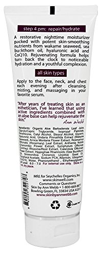 Wakame CoQ10 Firming Repair Night Cream by Skin by Ann Webb 3.5 oz Cream Wakame CoQ10 Firming Repair Night Cream 3.5 oz Cream Restorative nighttime moisturizer helps turn back the clock to a youthful complexion with noticeable hydration and firm toned radiant skin Ideal Skin Types all skin types especially dry mature and aging Directions Directions for Use During evening facial regimen after cleansing misting and applying skin-specific serums gently massage a pea size onto face neck and chest. Multiple Uses Carry products down to exposed skin on throat and chest area to help combat the signs of premature aging As an all-over anti-aging body lotion Other Ingredients Organic Aloe Barbadensis Leaf Juice Caprylic Capric Triglyceride Isopropyl Palmitate Dimethicone Cetyl Alcohol Stearyl Alcohol Glycerin Hyaluronic Acid Undaria Pinnatifida Extract (Wakame Seaweed) Arnica Montana Flower Extract Rosmarinus Officinalis (Rosemary) Leaf Extract Anthemis Nobilis (Chamomile) Flower Extract Symphyt