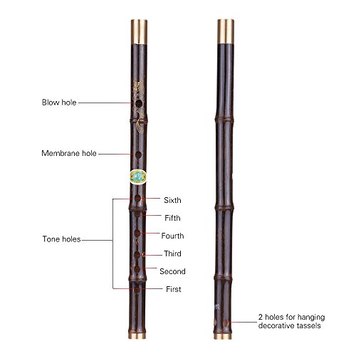 Features: Delicate bamboo flute, G key, easy to play. Quality natural black bamboo, smooth and glossy surface, exquisite copper wrap on two ends. Professional and precise tone holes contributes to the accurate tone, clear and melodious sound. 1 blow hole, 1 membrane hole, 6 tone holes and 2 holes for hanging decorative tassels. Comes with 2 packs of bamboo membrane and Chinese knot.