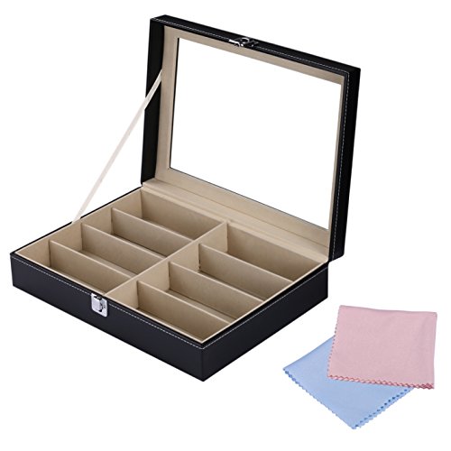 - STYLISH DESIGN - Stylish leatherette box to store and display your eyewear, jewelry, etc. Closed with a latch and can be easily opened. And two cleaning cloths for free! ( THE CLEANING CLOTHS ARE RANDOM COLOR )