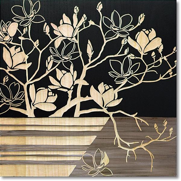 天然の木にペイントを施し、熟練した職人が彫刻刀を使って、1枚1枚彫っています。様々な木目が現れ、ネーチャーなモダンアートです。