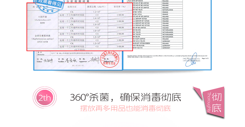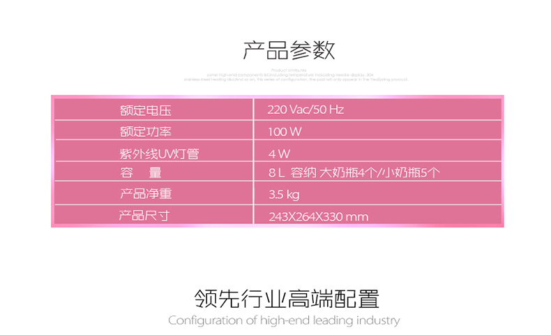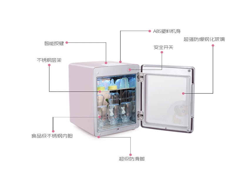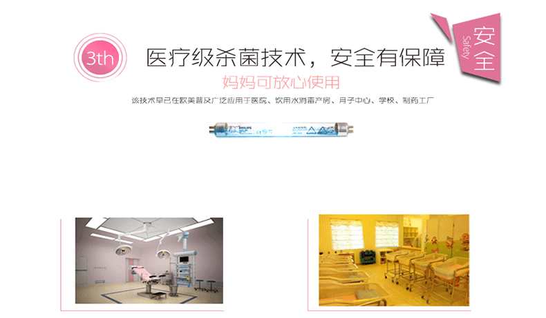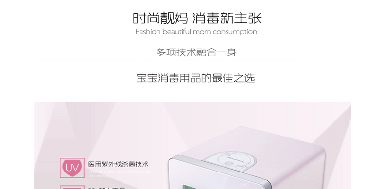 采用UV医用级别紫外线杀菌技术,8L容量可以放小口径6个奶瓶,大口径奶瓶5个。一键智能操作,涡轮热循环技术,低温暖风烘干,通过光波破坏分解细菌细胞达到杀菌作用,有效杀死细菌和病毒快速,高效,安全保障宝宝婴儿用品,能有效的杀局金黄色葡萄球菌,大肠杆菌,痢疾杆菌,沙门氏菌,蜡样芽孢杆菌,①波兰飞利浦原装进口紫外线灯管,医用级杀菌技术,杀菌效果99%以上。 ②涡轮恒温烘干技术+全密封常温消毒+1键操作+不锈钢内胆=健康+安全+方便