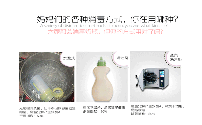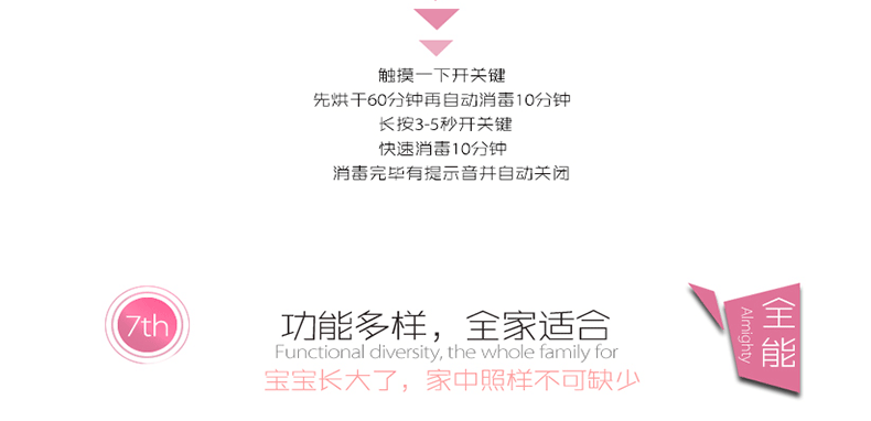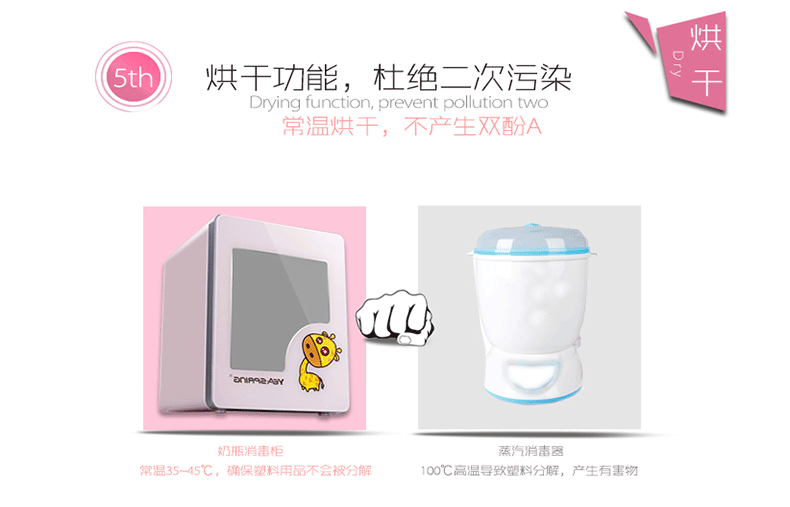 此款有两种功能:全自动消毒和烘干同时进行、单独快速消毒10分钟。带时间显示屏,8升容量,可放约6个奶瓶,小巧不占位置,是妈妈的好帮手!
