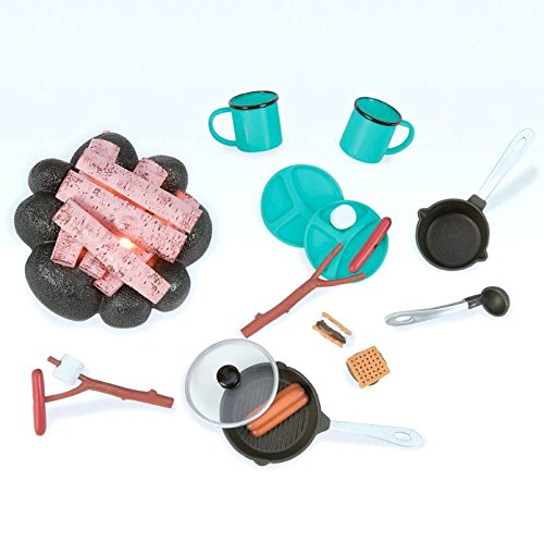 INCLUDES 16 ACCESSORIES – The Around the Campfire includes 1 Campfire with flickering lights (3 AAA batteries included), 2 roasting sticks with hot dogs and marshmallows, 3 servings of sausages, 2 s’mores, 2 camping dishes, 2 camping mugs, 1 pot, 1 frying pan with 1 lid and 1 ladle.