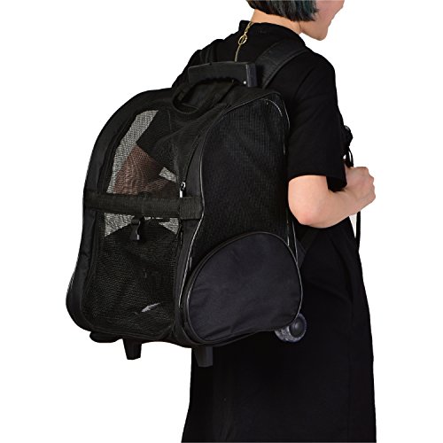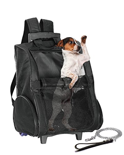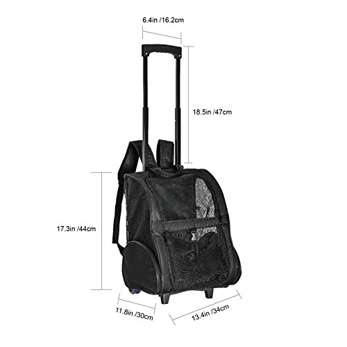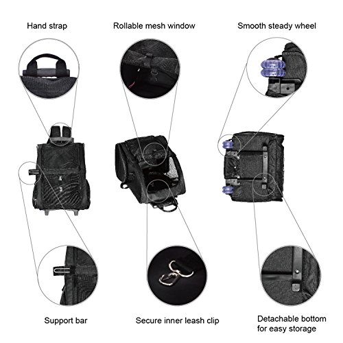 -. Feature : Soft-sided rolling backpack pet carrier make our little friends stay with us always and safe for travel,pet and us no one left / Portable pet carrier with handle and adjustable shoulder straps, recessed wheels let us move around smoothly make us feel no tired when taking our pet outside / Zipper pockets on both sides, pet food or toys can be stored, A leash clip inside to hang on pet's collar make them safe or avoid jumping out.Come with an extra free gift dog chain / Outer Dimensions 19.7"x14.2"x11". Max Load Weight:15 lbs. Please measure the pet before purchase / Mesh screens on 3 sides can be rolled up offering our pets a breathable visible and comfortable home, very convenient for us to take care of our pet
