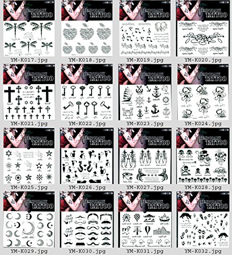 Wonbeauty 16pcs Fake and real temp tattoo stickers in a package,it including stars,cats,dragonflies,apples,music notes,cross,keys,skulls,moons,beards,animal footprints,spears,etc.