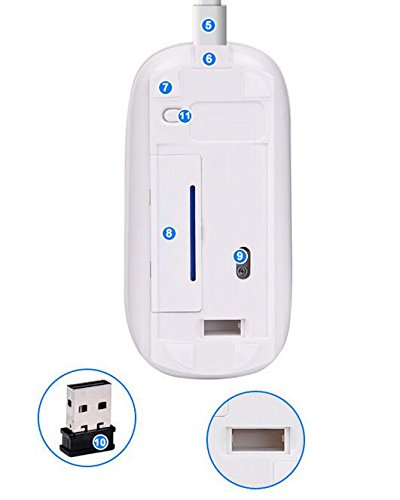 Feature : Features: Ergonomic Design, Rechargeable, Wireless, Silent Click, Scrolling Wheel, Ultra-thin / 2.4GHz Wireless Transmission / Quick-connect USB recharging/data cable: Automatically switches to data-over-cable mode while you're charging for non-stop gaming. / No additional software is required. Simply 'plug and play'. / Transmission distance: Over 10m