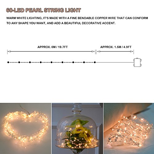 Powstro 20ft 60-LED Pearl Copper Wire String Light Warm White Fairy Lights for Craft Glass Bottle Valentines Wedding Party Xmas Battery Operated