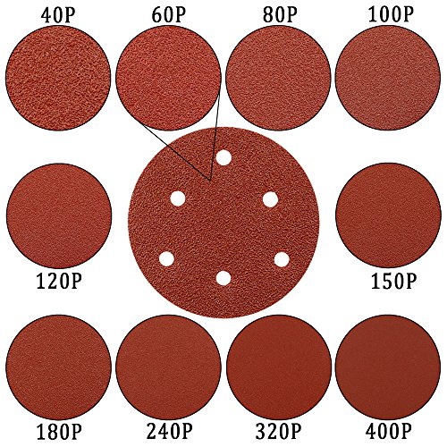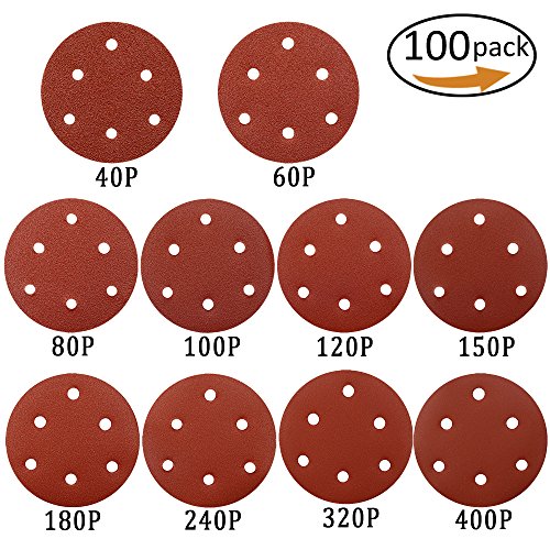 100 PCS 5 Inch 6 Hole Hook and Loop Sandpaper Sanding Disc Sandpaper Sanding Sheets Assorted 40 60 80 100 120 150 180 240 320 400 Grits for Random Orbit Sander,each size of 10 pieces