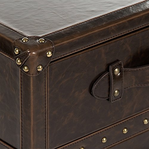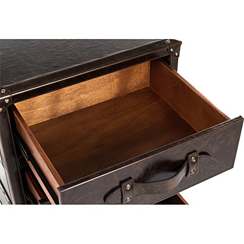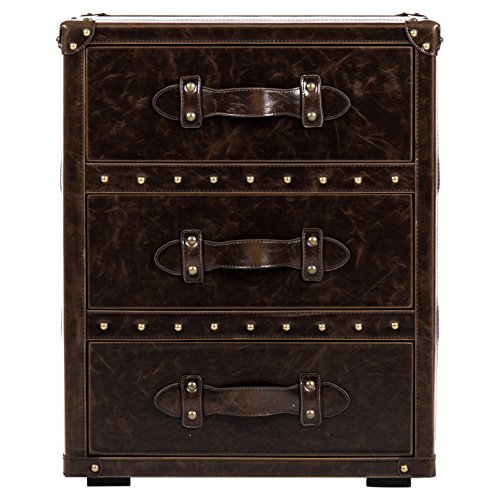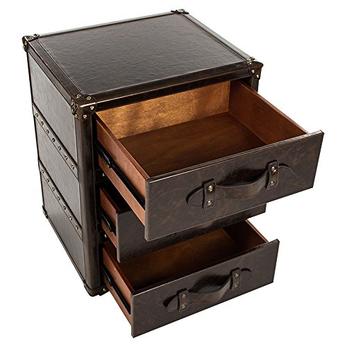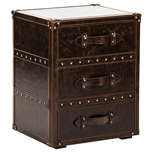 Studio : Kathy Kuo Home Publisher : Kathy Kuo Home Product Description Drawing on ornate 19th century vintage, this nightstand offers a bold and sophisticated style statement in the bedroom. The dark brown leather covering, boasting gold stud trims and a marvelous marble effect, encases a solid cube form. Leather studded corners and retro leather straps adds further period flair.