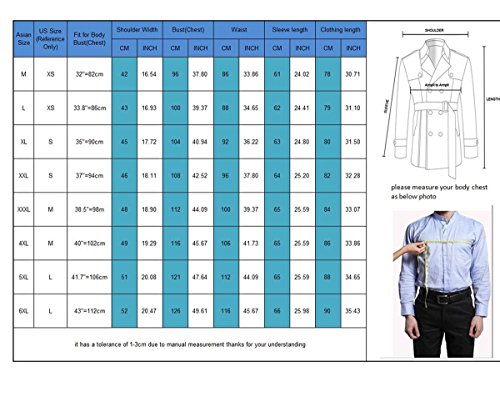 Product Description Slim Fit Bouble Breasted Twill Trench Coat With Self Belt Size L fit for body chest 35" Size XL fit for body chest 36" Size XXL fit for body chest 38" Size 3XL fit for body chest 40" Size 4XL fit for body chest 43" Size 5XL fit for body chest 45" Size 6XL fit for body chest 46" 0