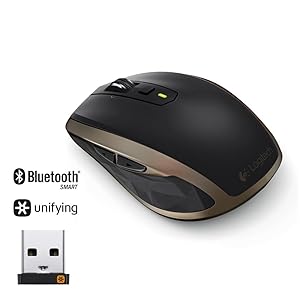 Tracks virtually anywhere Darkfield Laser Tracking gives you flawless cursor control even on glass* and high-gloss surfaces. Fly through long documents with Hyper-fast scrolling. Or shift to click-to-click mode for precise line-by-line navigation. | Sculpted, compact shape Crafted to fit your hand, this comfortable portable mouse gives you the control you need at home, at work and on the go. | Dual wireless connectivity Connect to Windows and Mac via Logitech’s smallest-ever (3 mm) Pico Unifying receiver or via Bluetooth Smart wireless technology. |