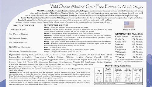 Canine Caviar Wild Ocean Alkaline Grain Free Entr�e All Life Stages is a L.I.D. Limited Ingredient Alkaline diet, a complete and balanced diet intended for moderately active dogs and nursing dogs. Wild Ocean is the most nutritious food you dog will ever need and is perfect for small and medium puppies. Beneficial nutrients aid in maintain beautiful skin and coat in longhaired dogs. Canine Caviar is like no product on the market today and we are able to say with pride that we offer pets the most nutritious diet available. We use only dehydrated meat of meal (no bone). We are the only company in the industry that offers a diet free of by-products and chemical preservatives while still including flaxseed and fishmeal. This provides pets with a natural and healthy Omega-3: Omega-6 fatty acid balance for a strong immune system, protecting animals from hot spots, allergies and dermatitis. We welcome you to learn about our products, about us, and to explore the Canine Caviar Natural Way to Pet Nutrition. Made in the USAFeature