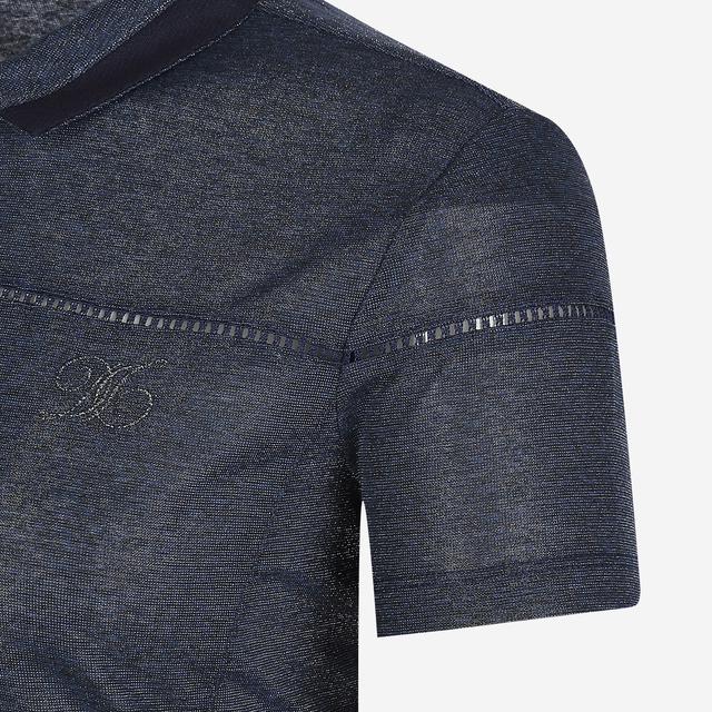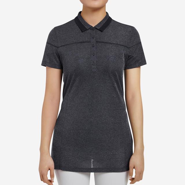 전면에 글리터한 컬러감으로 화려하며 힙을 덮는 기장감으로 여성스러움을 돋보여주는 반팔 티셔츠입니다.