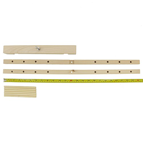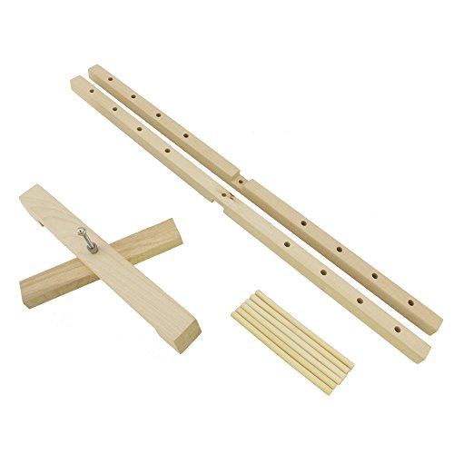It can be easily adjusted by moving dowels to hold various sizes of skeins between 24-60 inches (or 2-5 feet) in circumference.