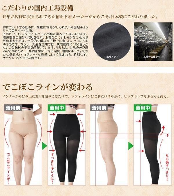 ストッキングなのに、ガードルと一体化。ウエストまでカバーして、お腹の上へも、お肉を逃しません。履きながら骨盤を安定させ、少しずつ正しい位置へと導きます。立体的に編んだソフトガードル機能で、キュッと上向きヒップに。足首からふくらはぎ、膝、太ももなど、各部に適した強さで段階的に着圧しています。 |