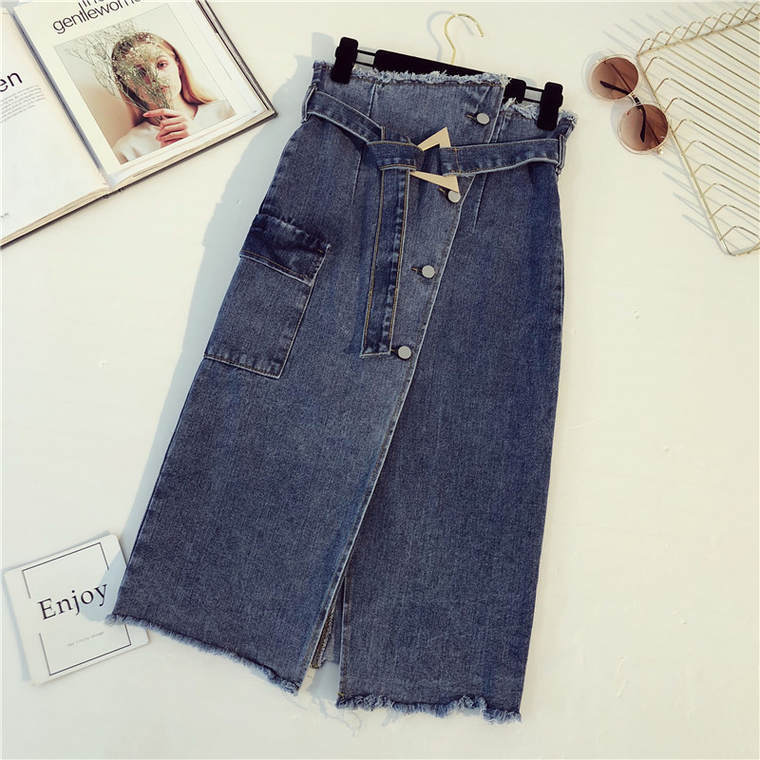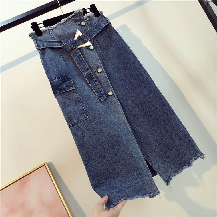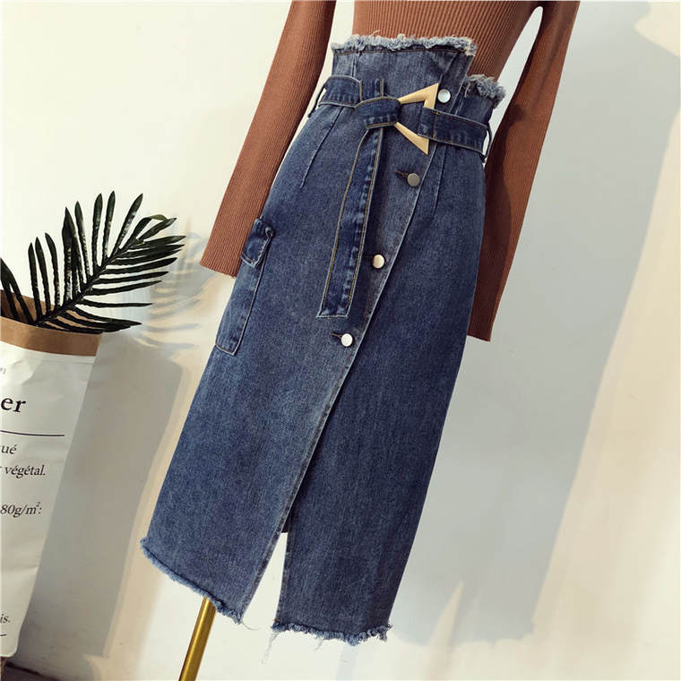 デニム生地のレトロなハイウェストスカートで、ベルトも付いています!