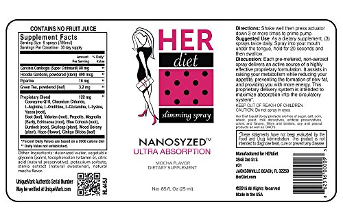 -. Binding : Health and Beauty -. Brand : HERdiet -. EAN : 0862516000093 -. Feature : Every single HERdiet bottle comes with Authentic Serial Number for customer security. / DECREASED APPETITE! Stop cravings for extra food and snacks. Great Tasting Mocha Flavor with Instant Absorption Spray / No Difficult to Swallow Diet Pills and Convenient to Take Anywhere / Stimulant Free Diet Aid- No Jitters. For Optimal Results Combine with HERdiet Pills / Revolutionary Diet Aid- MUST TRY FOR ALL WOMEN -. IsAdultProduct : 0 -. Label : HERdiet -. LegalDisclaimer : Every single HERdiet bottle comes with Authentic Serial Number for customer security. -. Manufacturer : HERdiet -. PackageQuantity : 1 -. ProductGroup : Health and Beauty -. ProductTypeName : HEALTH_PERSONAL_CARE -. Publisher : HERdiet -. Studio : HERdiet -. Title : HERdiet Slimming Spray with Nanotechnology 1 Month Supply Mocha Flavor Weight Loss Diet Aid Appetite Suppressant Non Stimulant -. UPC : 862516000093
