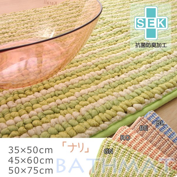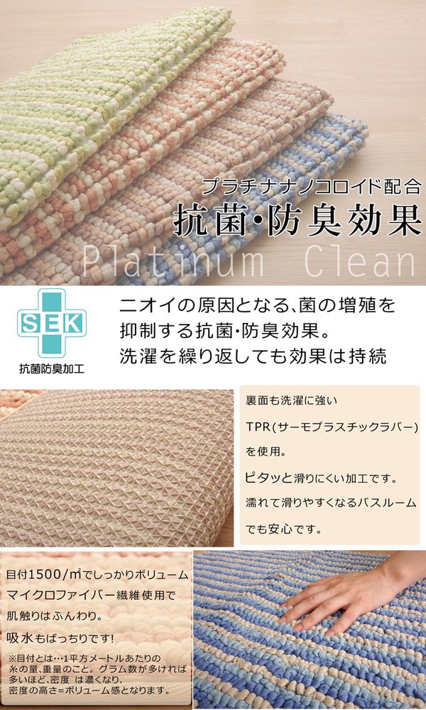 肌触りの良いマイクロファイバーを使用したバスマットです。高目付でしっかりとボリュームがあります。生地には、プラチナナノコロイドを配合しています。本商品の特徴として、(1)抗菌・防臭効果を強め、洗濯を重ねても、その効果を落ちにくくします。50回洗濯しても、抗菌・防臭効果を維持します。(2)洗濯物を室内に干したときに発生する「生乾きの嫌なニオイ」。その原因菌であるモラクセラ菌を抑制し、部屋干ししても、生乾きの嫌なニオイがありません。(3)SEKマーク(青ラベル)を取得。(4)吸水力に優れたポリエステルマイクロファイバー糸を使用しています。(5)裏面の滑り止め加工により、滑りにくく、表からの水分を床面に通しません。
