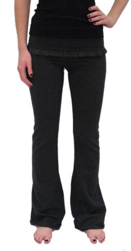 Just look at these fabulous new yoga pants!! A super cute twist on the traditional roll down style. Made by the cool company So Low, these pants feature a feminine ruffle along the bottom edge of the roll down waist. The So Low logo is embroidered on the back. We receive complements every time wear these stylish yoga pants! Available in black and beautiful heathered charcoal (pictured), which is a nice alternative to black and pairs well with nearly any color. 90% Cotton / 10% Spandex.Feature