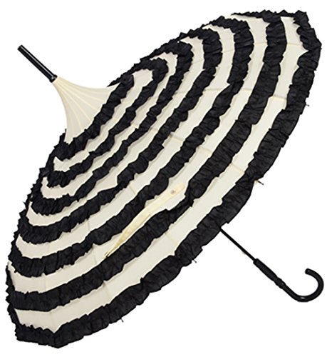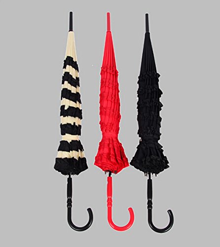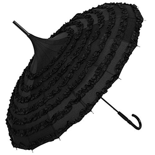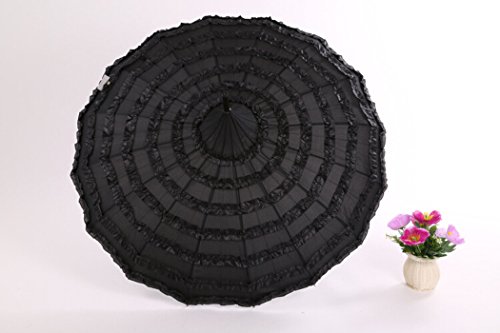 -. Feature : Elegant pagoda shaped umbrella with lace ruffles ornament / Opened Diameter: 88cm(34.6in); Length: 86cm(33.8in) / Material: Pongee + Lace / Elegant and graceful, and fits all occasions / Perfect protection in sunny or rainny days