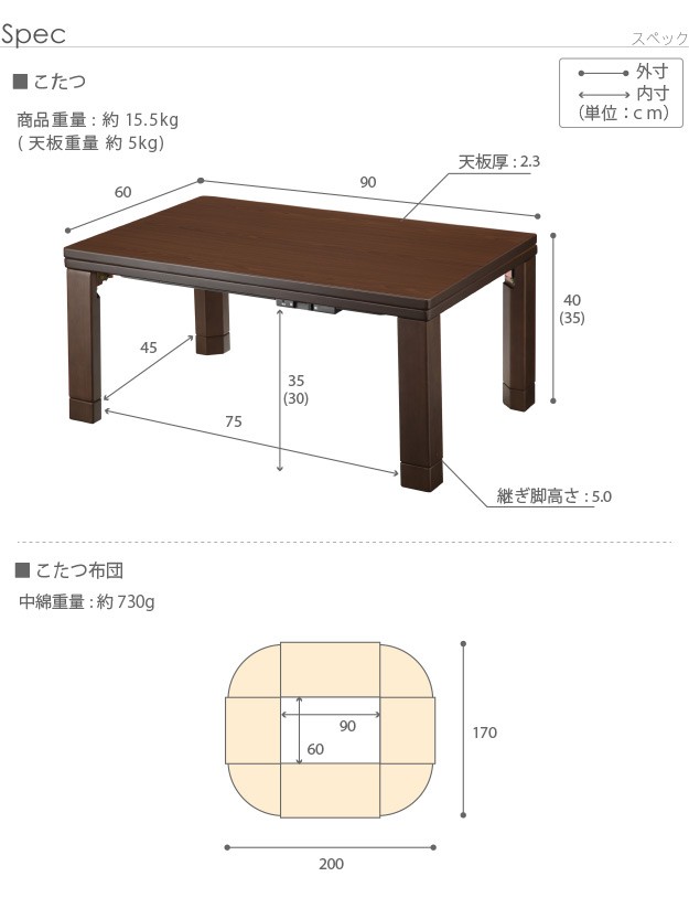 幅90x奥行60x高さ35/40cm(継脚5cm)