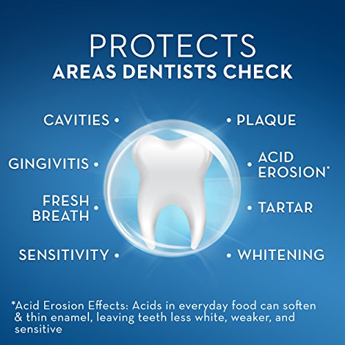 -. Feature : Superior Cleaning versus sodium fluoride toothpaste / Healthier gums by fighting plaque / Whitens teeth by removing surface stains / Strengthens enamel and fights cavities / Protects 8 areas dentists check: Cavities, Gingivitis, Acid Erosion Effects, Sensitivity, Plaque, Tartar, Whitening, Freshens Breath Acid Erosion effects: Acids in everyday foods can soften and thin enamel, leaving teeth less white, weaker, and sensitive