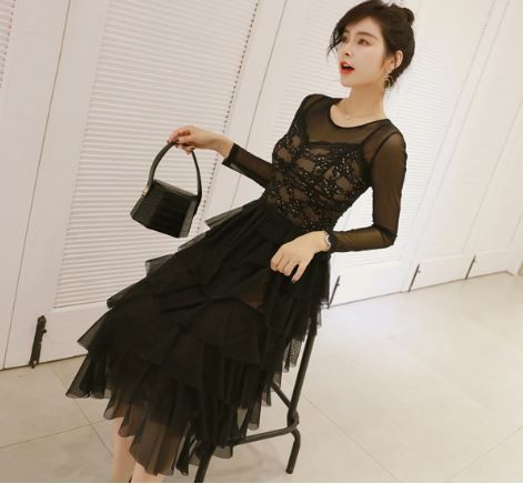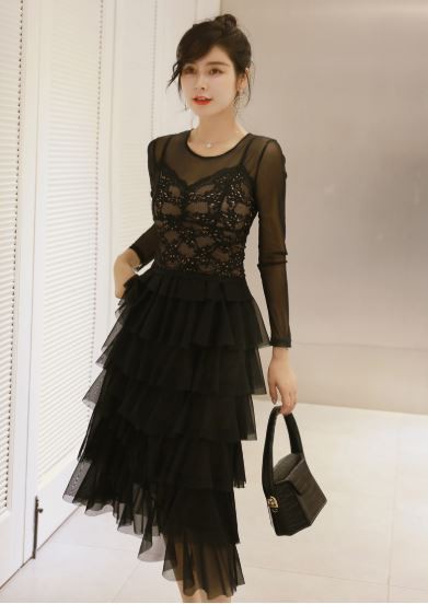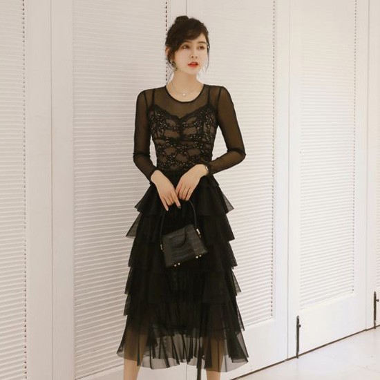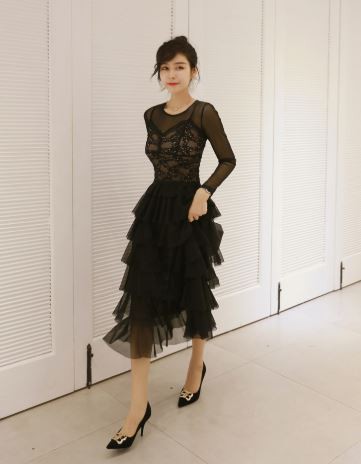 レース生地のティアードスカートが華やかなパーティードレスです。